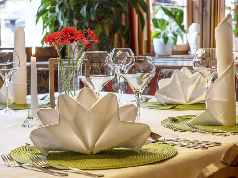 Ein Genuss ist auch unser 4-Gänge-Menü (im Winter 5-Gang-Menü), bei dem ihr aus drei verschiedenen Hauptgerichten (am Ruhetag aus 2 Gerichten - Schwerpunkt Österreich, wie z.B. Wiener Schnitzel usw.) wählen könnt. Wir bieten regionale Schmankerl von leicht bis deftig und natürlich auch feine internationale Küche. Auf Wunsch servieren wir gerne auch laktose- und glutenfreie sowie vegetarische Gerichte. Wir bitten um Verständnis, dass wir bei allen anderen Abänderungen der Menüs, auf Grund von Allergieen, pro Person und Nacht einen Aufpreis von Euro 20,00 € berechnen.
