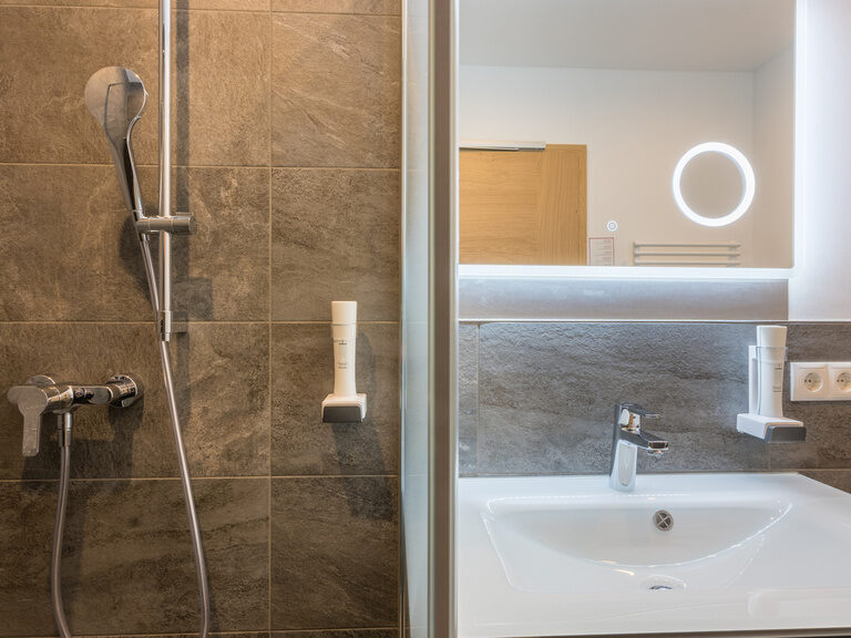 Das Einzelzimmer "Wildried" verfügt über ein Fenster und ist für seine kleine Größe (etwa 15 QM) sehr gut ausgestattet und bietet Platz für bis zu 2 Personen. Das moderne Bad, mit großer Dusche und WC ist mit feinen grauen Steinfliesen eingekleidet und der LED-Spiegel mit integriertem Kosmetikspiegel verfügt über 3 verschiedene Lichtmodi. Sämtliche Möbel sind in Schreinerhand und aus bis zu 300 Jahre altem Altholz aus der Region gefertigt. Elegante Textilien in edlem Violett unterstreichen den Charme dieses Zimmertyps und laden zum Wohlfühlen ein. Wie alle Zimmer verfügt auch das "Wildried" über einen Fernseher mit Radiokanälen und einer digitalen Gästemappen (Tablet) mit vielen Features, unter anderem Ausflugstipps, zahlreiche Tageszeitungen und Informationen über unser Haus. Der Kofferbock dient zum komfortablen Ausladen des Gepäcks und als bequeme Sitzmöglichkeit. Der Schrank ist gut aufgeteilt und bietet auch ausreichend Platz für längere Aufenthalte. Der im Schrank eingebaute Zimmersafe ist digital und kann mit einer 4-stelligen Nummer selbstständig programmiert werden.