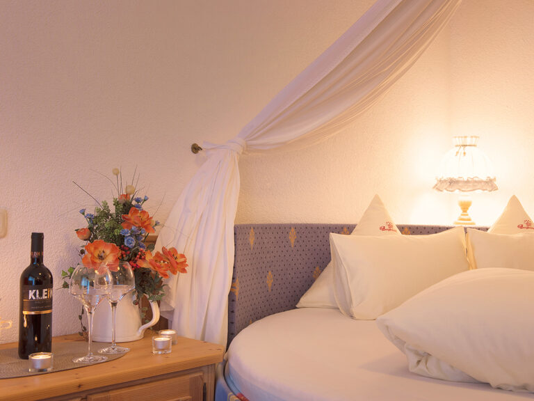 Es erwartet Sie ein romantisches Flair mit einem runden Himmelbett und einem separaten Badezimmer mit Badewanne. Das Zimmer ist hell und mit stilvollen Echtholzmöbeln ausgestattet.